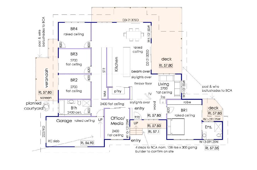 Anyway, Nat was busting to finally build a place of his own after doing it for others for so long. He had a pretty good idea of what he wanted, so I helped draft it up with some design feedback on passive solar and the like. We drew a line marking the bushfire level zone boundary, another showing the street setback and another, the existing driveway. These lines described a wedge shaped square, which is not ideal for passive solar but workable.